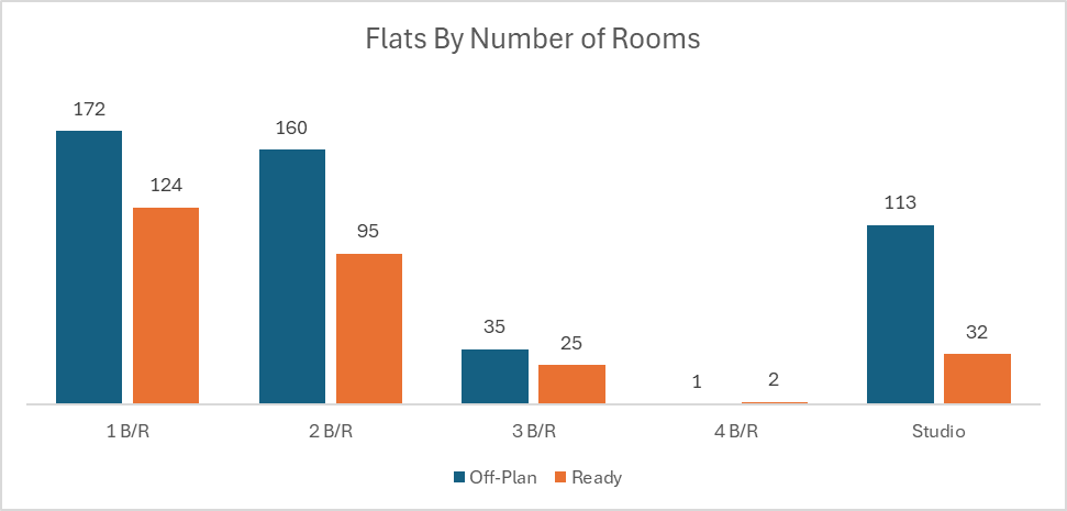 Off-plan activity was overwhelmingly flat-led, with commercial and villas sharing most of the remaining value.