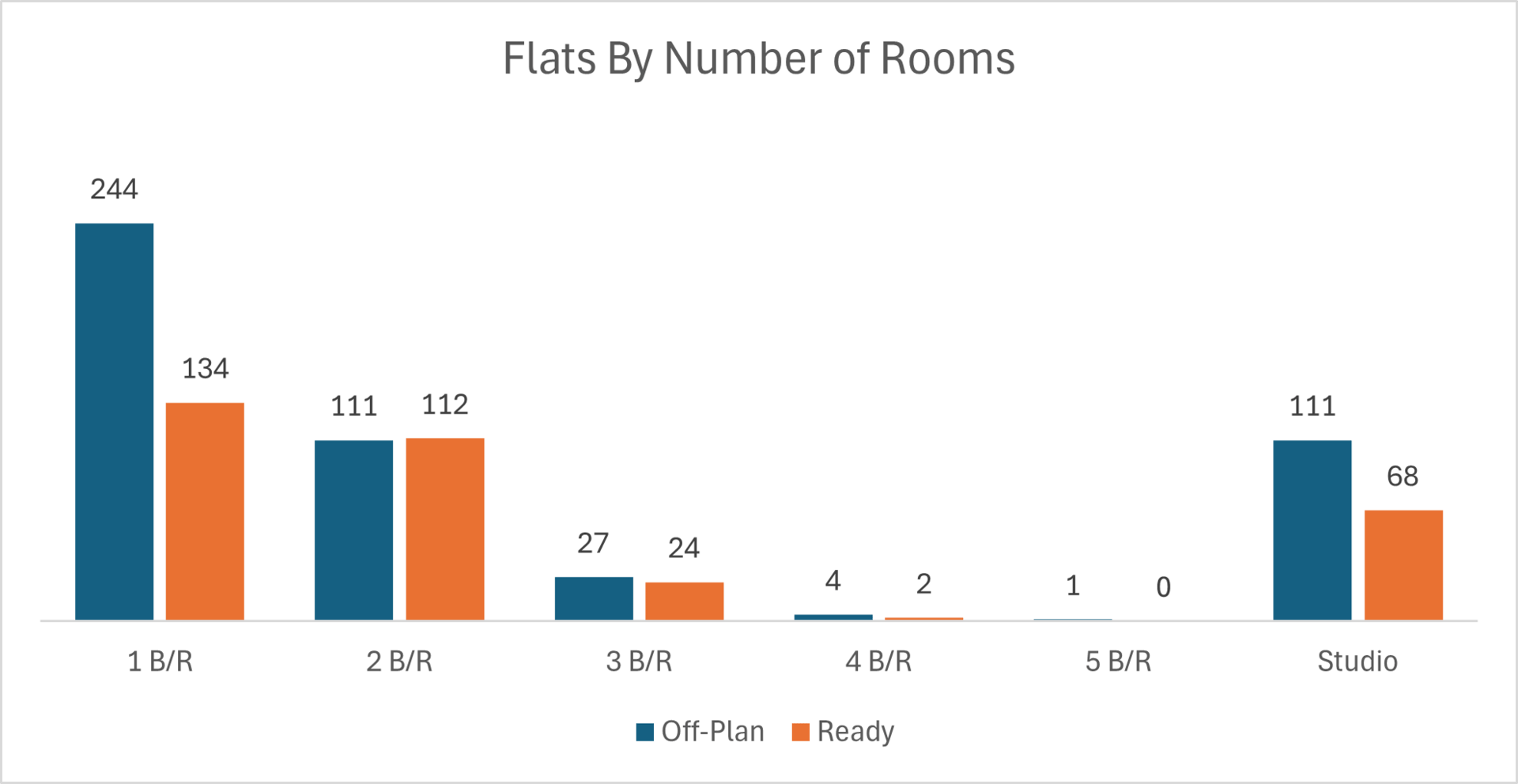 Off-plan activity was led decisively by flats, with villas a meaningful secondary driver; commercial and hospitality segments were marginal.