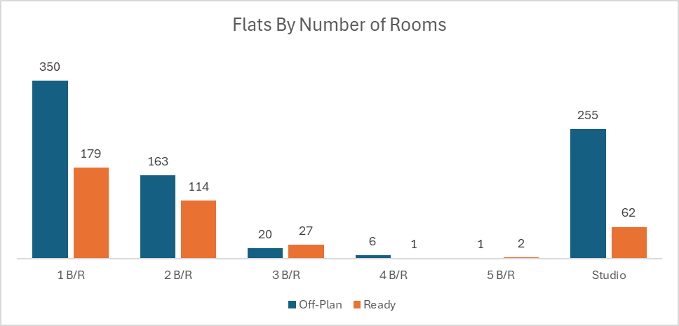 Off-plan activity was heavily flat-led, with modest support from villas and limited hospitality/commercial volumes.