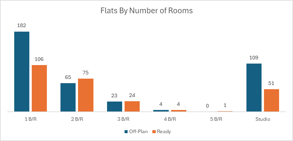 Off-plan activity was clearly apartment-led, with nearly seven out of every ten dirhams flowing into flats, while villas captured a strong secondary share. Commercial and hospitality assets remained a very small, more specialised slice of the off-plan market for the day.