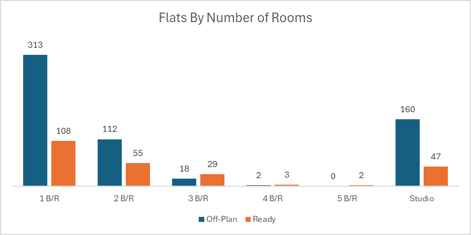 Off-plan activity was led by flats, with villas providing a solid secondary lift; other segments were marginal.