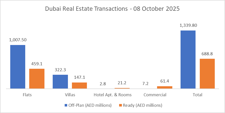 On 08-Oct-2025, the total transacted value reached AED 2,028,606,857. Off-plan dominated with AED 1,339,781,699 (66.0%), while Ready accounted for AED 688,825,158 (34.0%).