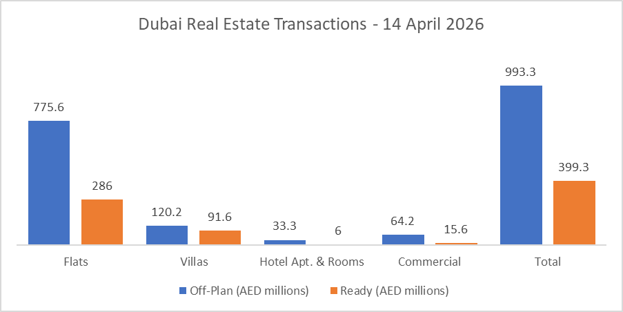 On the 14-Apr-2026, the total transacted value reached AED 1.39 billion. Off-plan dominated with AED 993.3 million (71.3%), while Ready accounted for AED 399.3 million (28.7%).