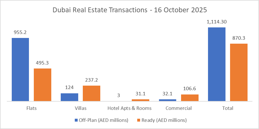 On 16 October 2025, the total transacted value reached AED 1,984.6 million. Off-plan dominated with AED 1,114.3 million (56.1%), while Ready accounted for AED 870.3 million (43.9%).
