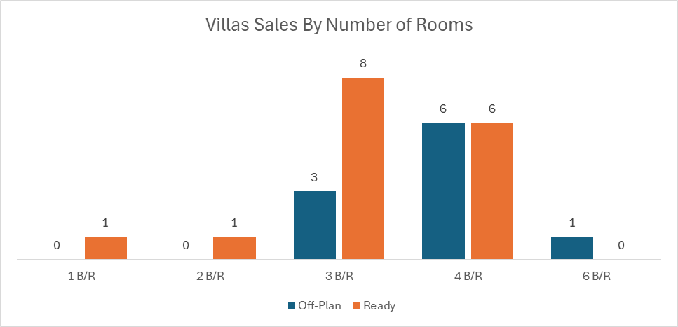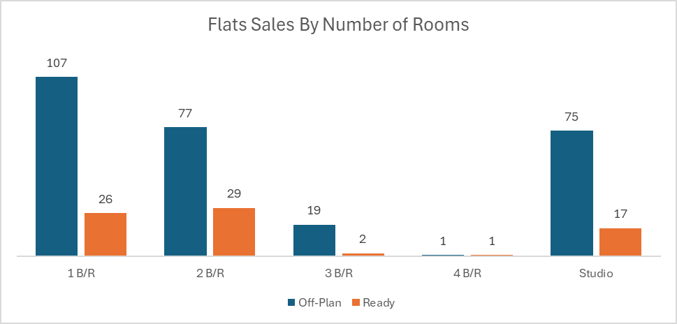 Ready transactions were more balanced than off-plan, with flats leading the segment, but commercial properties capturing a sizable share and villas also making a meaningful contribution.