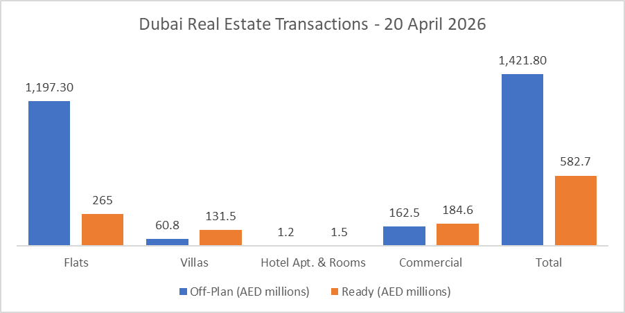 On the 20-Apr-2026, the total transacted value reached AED 2.0 billion. Off-plan dominated with AED 1.42 billion (70.9%), while Ready accounted for AED 582.7 million (29.1%).