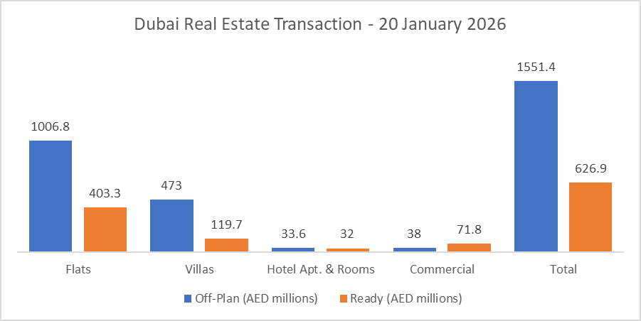 On the 20-Jan-2026, the total transacted value reached AED 2.18 billion. Off-plan dominated with AED 1.55 billion (71.2%), while Ready accounted for AED 626.9 million (28.8%).