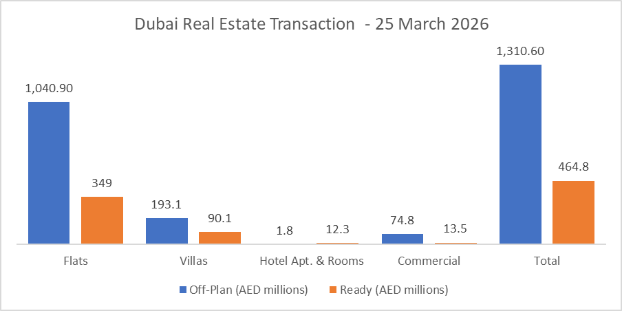 On the 25-Mar-2026, the total transacted value reached AED 1,775,371,984. Off-plan dominated with AED 1,310,580,346 (73.8%), while Ready accounted for AED 464,791,637 (26.2%).