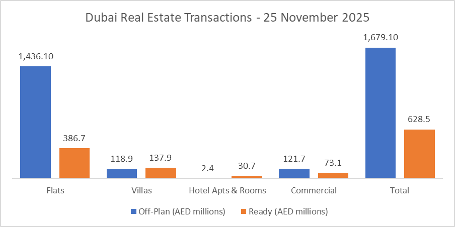 On the 25 November 2025, the total transacted value reached AED 2,307,665,365. Off-plan dominated with AED 1,679,132,365 (72.8%), while Ready accounted for AED 628,533,000 (27.2%).