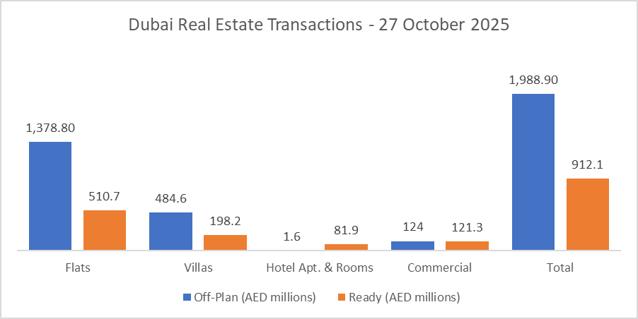 On 27-Oct-2025, the total transacted value reached AED 2,901,047,946. Off-plan clearly dominated. Off-plan contributed AED 1,988,908,395 (68.6%), while Ready accounted for AED 912,139,551 (31.4%).