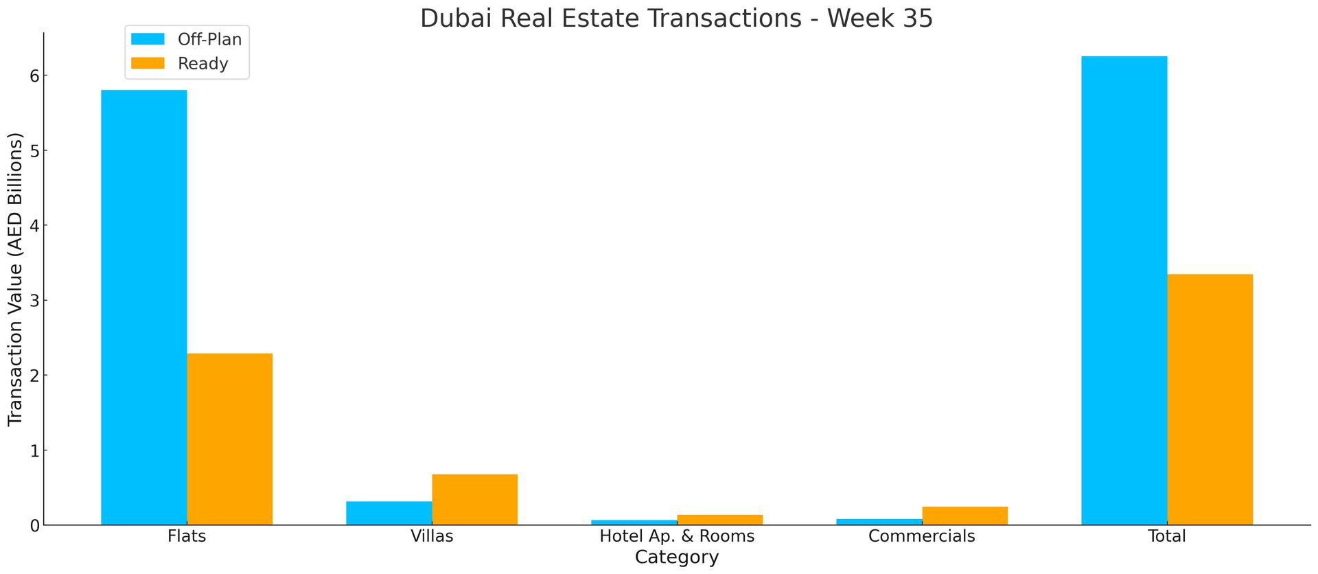 Total trading reached AED 9.60 billion across 4,942 transactions, a -5.2% drop in value and -4.7% decline in activity versus last week (AED 10.12 billion, 5,188 deals). Off-plan dominated by value with a 65.2% share (AED 6.26 billion), while ready assets contributed 34.8% (AED 3.35 billion).