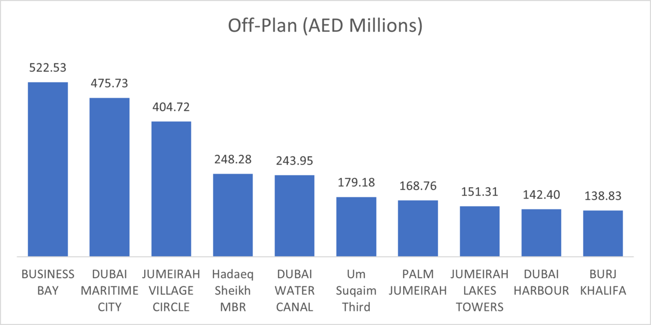 BUSINESS BAY: Tops the chart for off-plan transactions with a staggering AED 522,527,645, highlighting its status as a prime location for investors seeking new development opportunities.